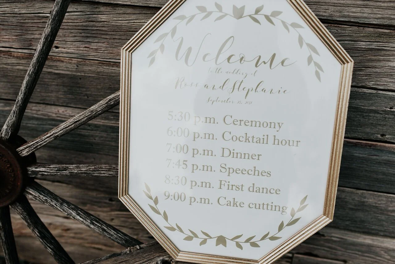 Stephanie designed all the signage herself and used thrifted frames, along with beautiful thrifted candlesticks to set the mood. Ross built the bar used at the reception and the “Giant Jenga” yard game by hand. Another special touch was the ceremony pieces made by Stephanie's mother. She stitched together her daughters “something blue” handkerchief, the tartan flowers in the bouquets, and the ring bearer's, as well as Sammy the dog's, bowties.
