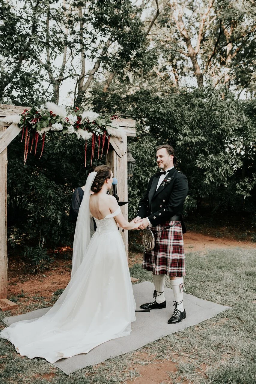 The couple engaged in a handfasting ceremony before saying their vows. This was a very special handfasting blessing because the three bands that were used were representative of the bride and groom - a piece from the bride’s mother's wedding veil, signifying her past, a strip of the groom’s tartan, signifying his past, and a ribbon cut from their wedding décor, signifying their future.