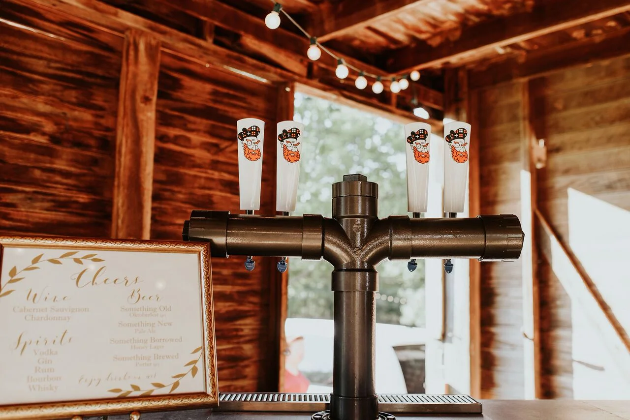 After saying "I Do," the party moved to the barn for dinner and dancing. Music was provided by All Out DJ. Drinks were provided by Ross' own brewery, The Angry Scotsman. These tasty brews, along with sips from the scotch and whiskey bar, were served from personalized glassware that doubled as place setting tags and party favors.